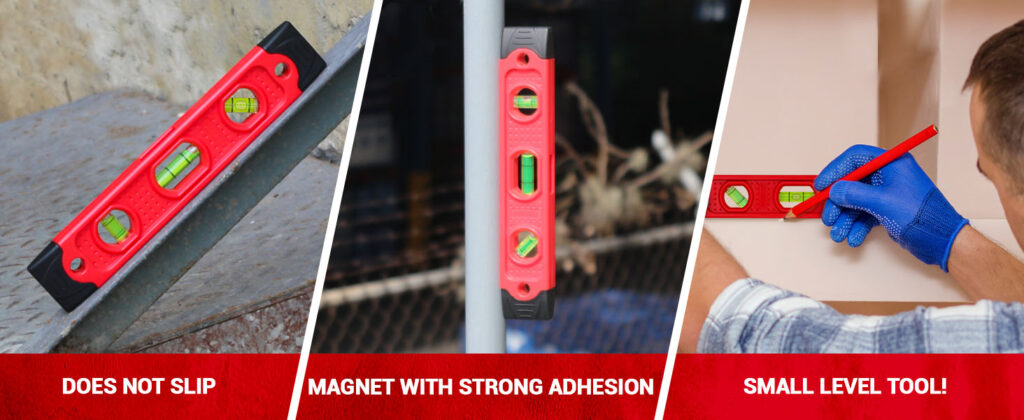 - | MAGNETIC SUPPORTS FOR METAL SURFACES| a magnetic tape with superior holding force than others, holding firm on metal surfaces, you can drop the tool with confidence without worrying that it may fall, torpedo level magnetic has two holes on the edges for easy storage